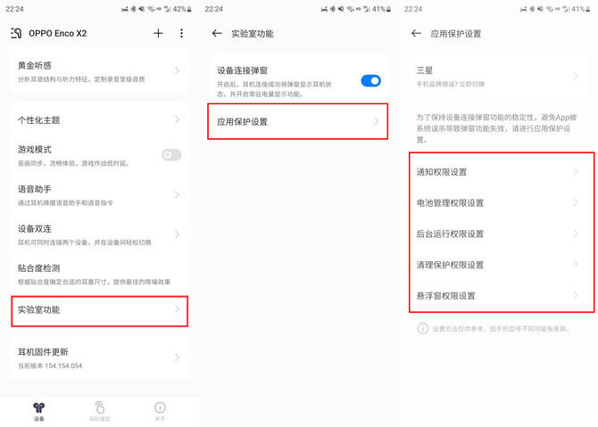下载完成后,我们打开App并连接耳机,点击实验室功能,开启设备连接弹窗,把应用保护设置全部开启。