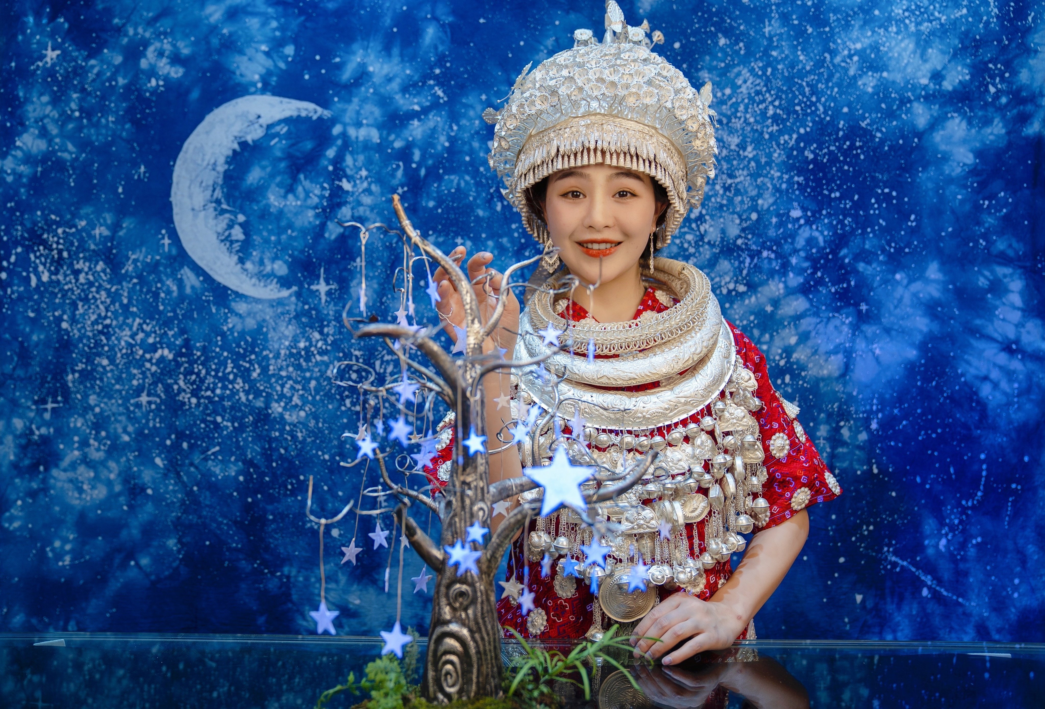 2022年虎年春晚上,少儿舞蹈《星星梦》结尾,航天员王亚平的女儿喊着:“妈妈,给我摘一颗星星回来。”潘雪看到这温馨的一幕后,就尝试用苗族技艺制作“非遗版星空”,把一颗颗“银星星”挂满银树,帮王亚平女儿“摘星”。