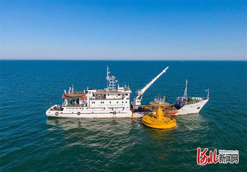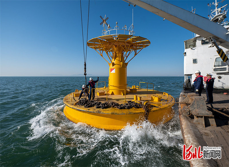 2月25日,航标船工作人员布设渤海首座直径10米的海上测风浮标。