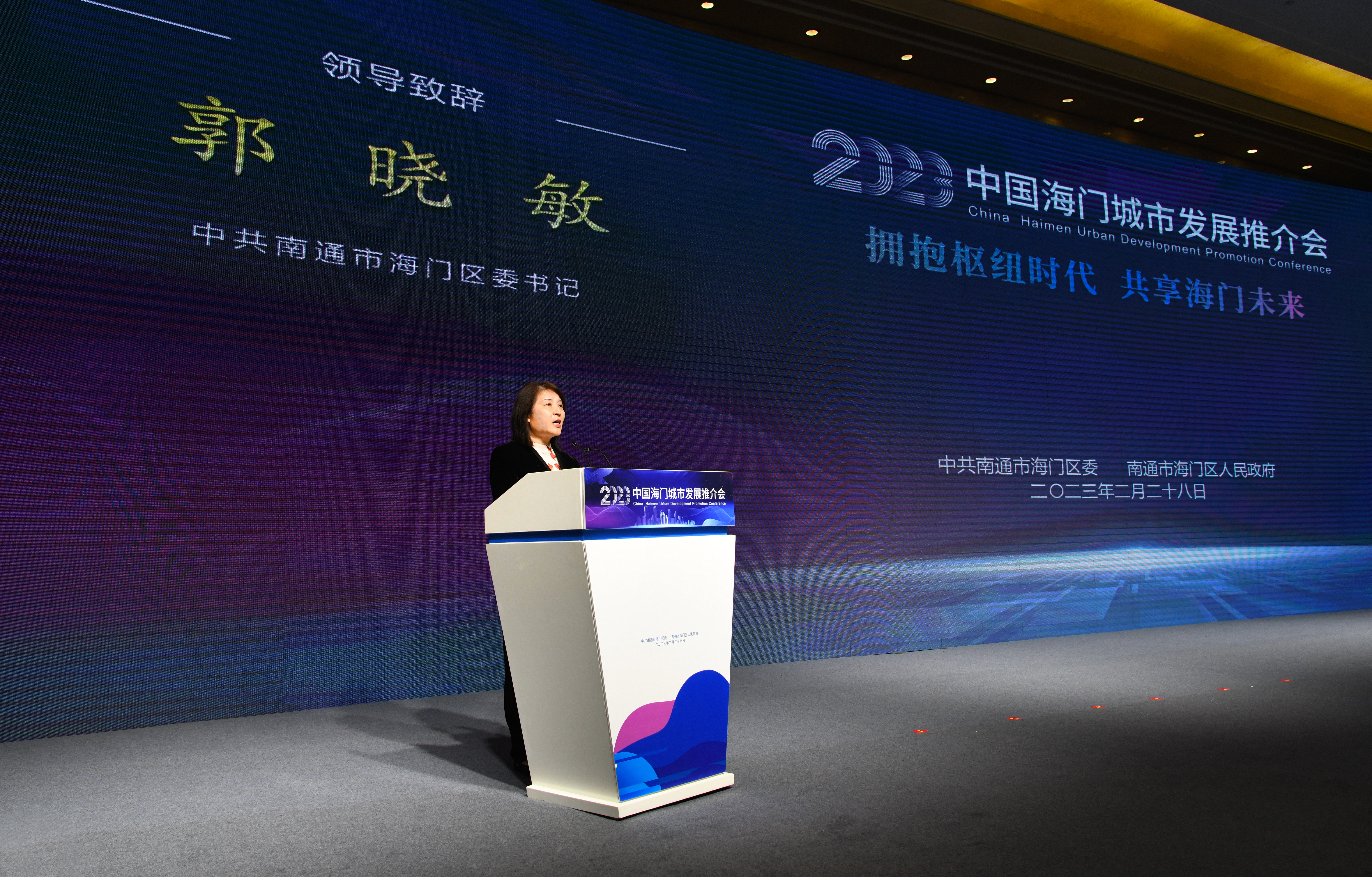 海门区委书记郭晓敏在推介会上致辞。