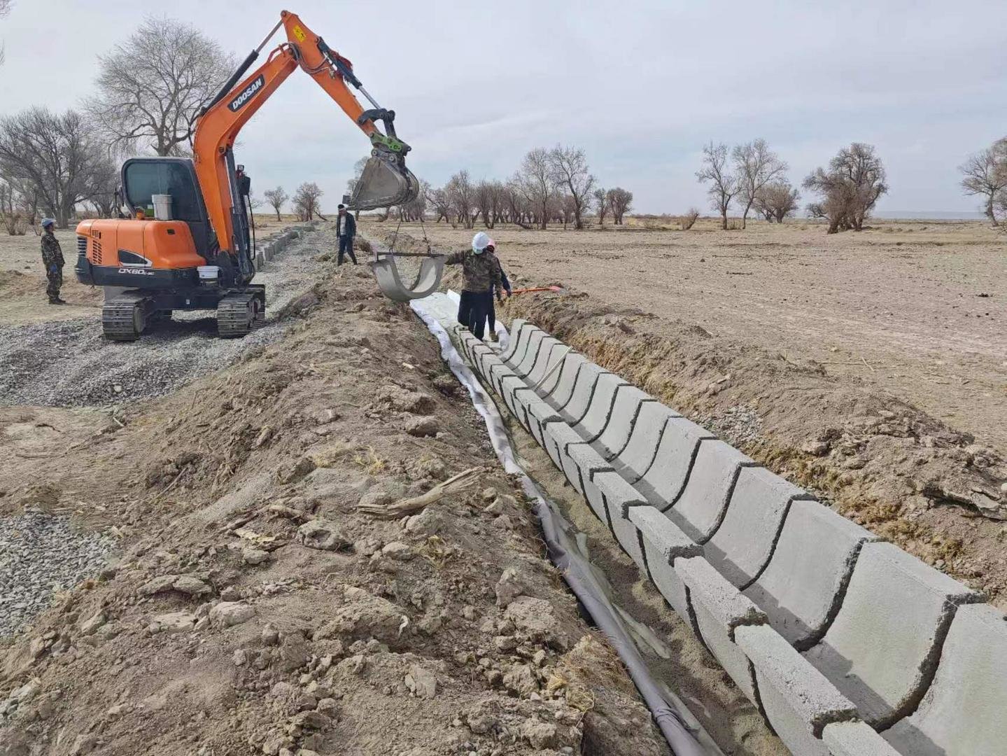 在瓜州县榆林河、桥子灌区渠道建设工程现场,工人们正在忙着将提前拉运好的U型砼渠砖衬砌到开挖好的渠道内。