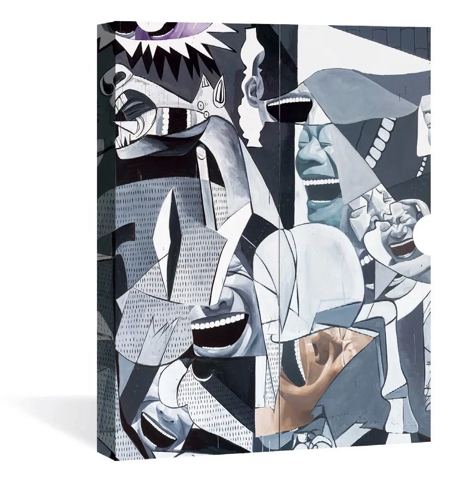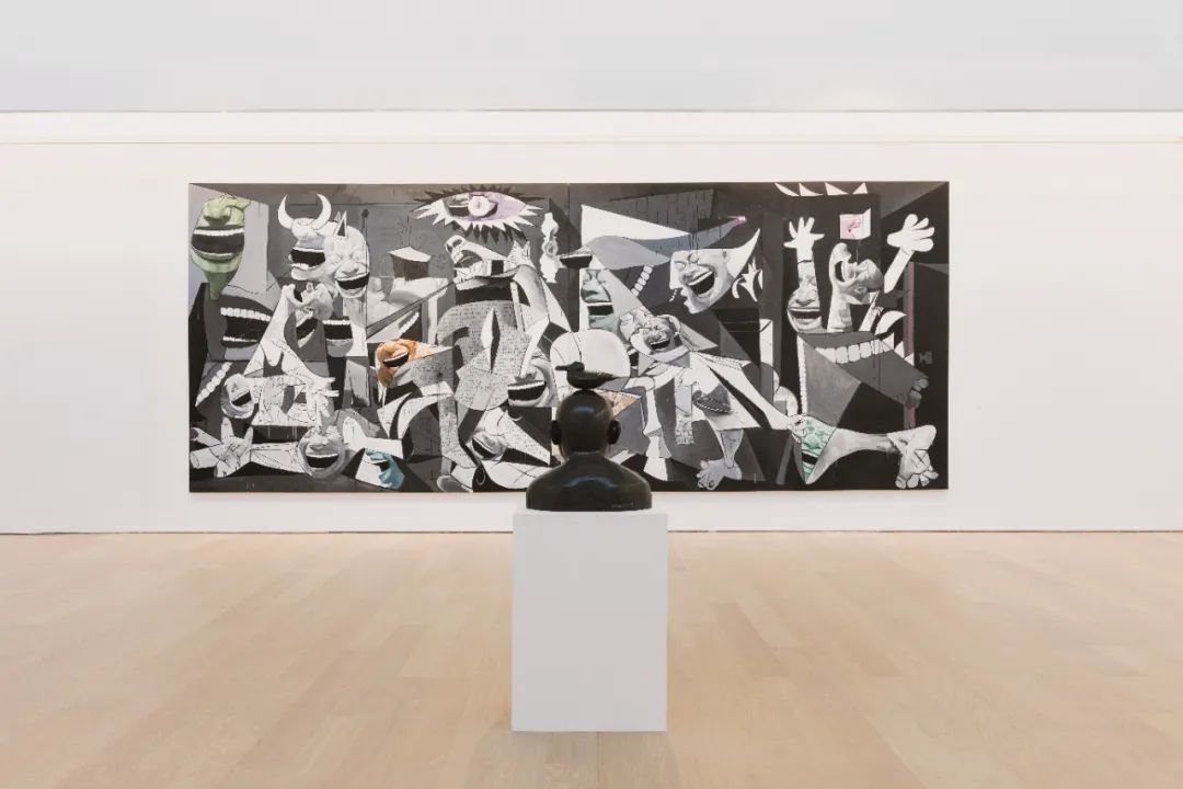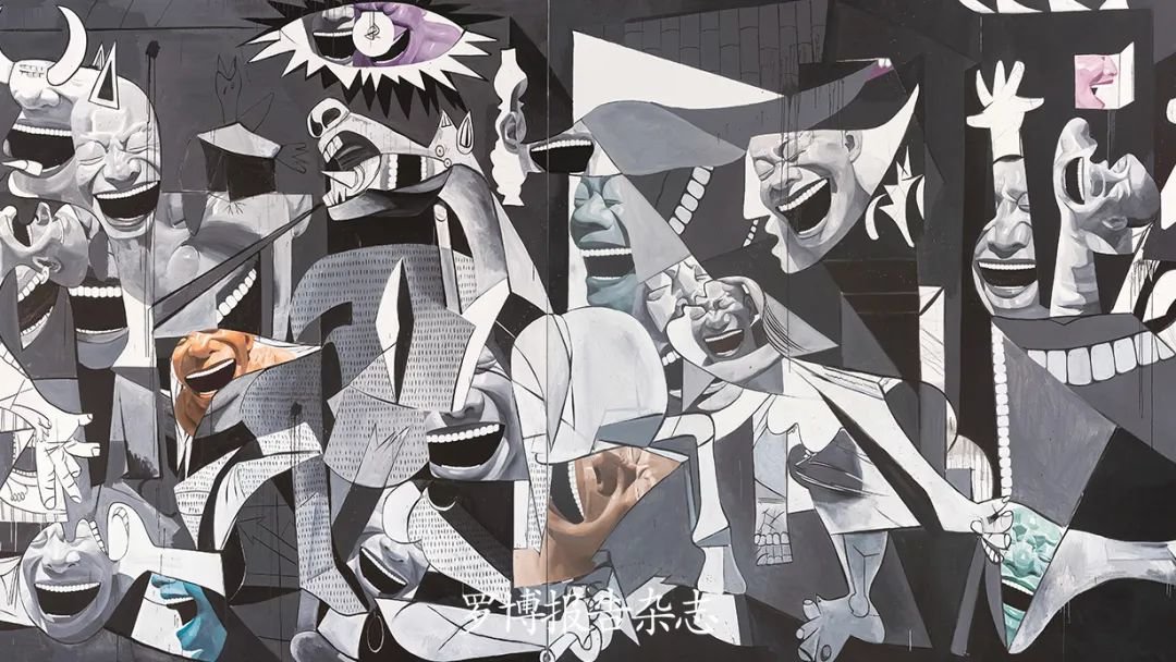 众所周知,《格尔尼卡》是毕加索的代表作,堪称现代艺术史上的一次地震。毕加索以立体主义的表现手法,将直指现实的政治批判性与充满戏剧性的战争场面交织构成,拉开了后立体主义的序幕。韩国独立策展人金基富在文章《幸福——在美术馆中寻找闭眼张嘴的人》中对《格尔尼卡》和岳敏君艺术之间的关系,如此解读:为了以自己的方式再解读毕加索的《格尔尼卡》,岳敏君从2019 年起便着手并研究毕加索的作品。在深入思考了毕加索的创作原理和方法论后,岳敏君根据自己的创造性意图,重构了毕加索的多面性和节奏感等艺术特性,将其融入令人震颤的新画面之中……岳敏君在《我与毕加索》中,将毕加索多维度表现的立体主义人物及生灵的断面,以自己的角色代替,并赋予写实主义的笔触,从而解除了原作的立体构成。