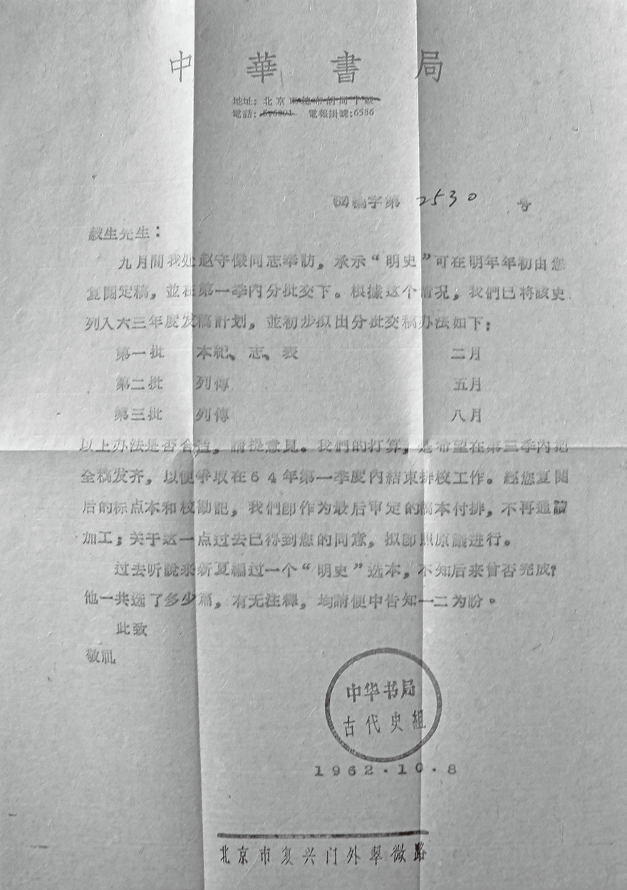 1962年10月8日中华书局为《明史》点校致郑天挺函