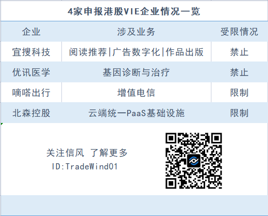 信风(ID:TradeWind01)据2月18日至2月28日向港交所递交IPO申请的13家企业统计,宜搜科技控股有限公司(下称“宜搜科技”)、UGenix Biotech(下称“优讯医学”)、嘀嗒出行和Beisen Holding Limited(下称“北森控股”)4家发行人均搭建了VIE架构,且涉及限制或禁止外商投资的领域。