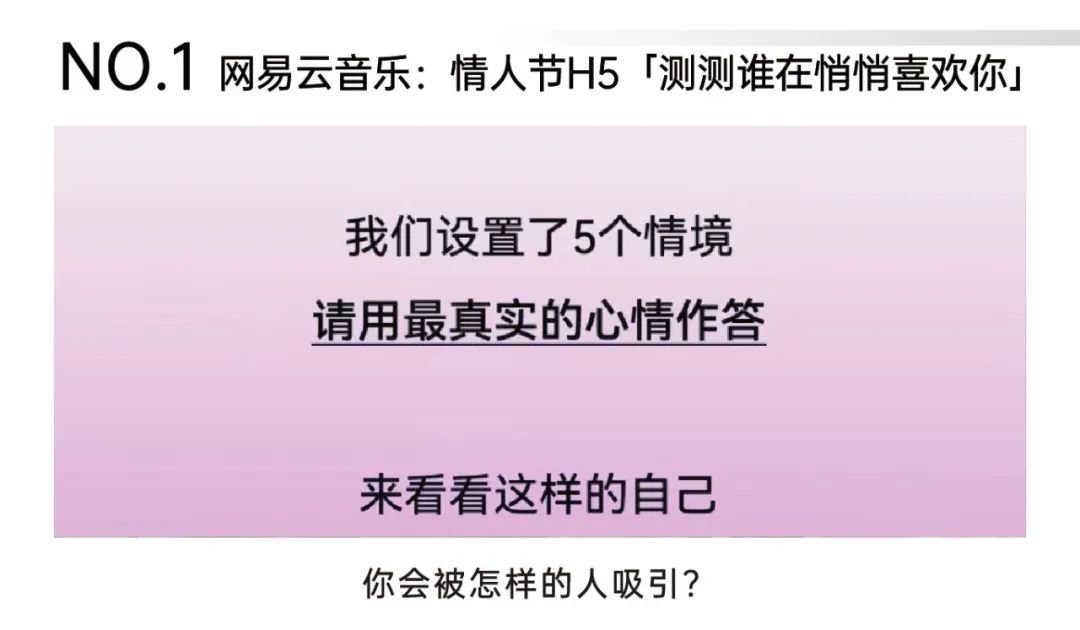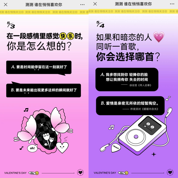 2月14日,网易云推出情人节H5「测测谁在悄悄喜欢你」,通过5个情景式问题生成一份专属吸引力报告,并将恋人的特质分为小狗、狮子、海豚、小狼、狐狸5个可爱的动物形象。