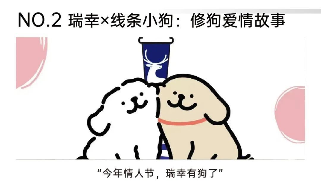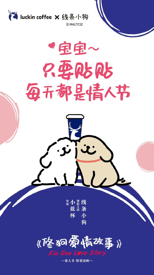 2月14日,瑞幸联名线条小狗,发布以《修狗爱情故事》为主题的短片,32s的小视频分为异地恋篇、吵架篇和简单篇三部分,甜蜜的故事情节、可爱的修狗形象,让人坠入修狗的爱情故事中。