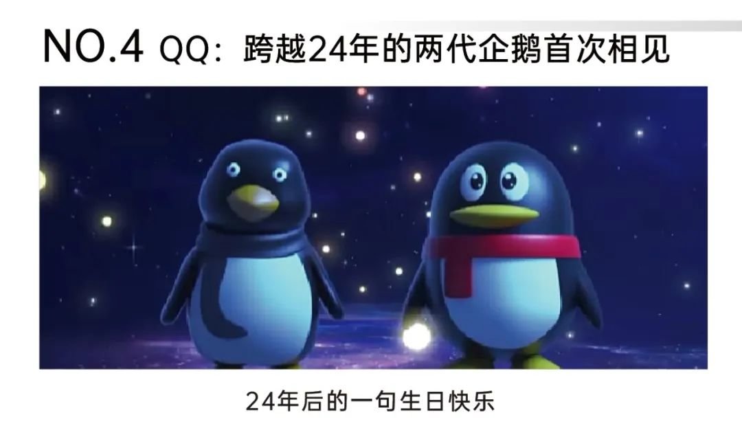 2月11日,QQ上线“跨越24年的两代企鹅首次相见”的短片,以两只企鹅的视角穿越时空,讲述24年来QQ的变化。