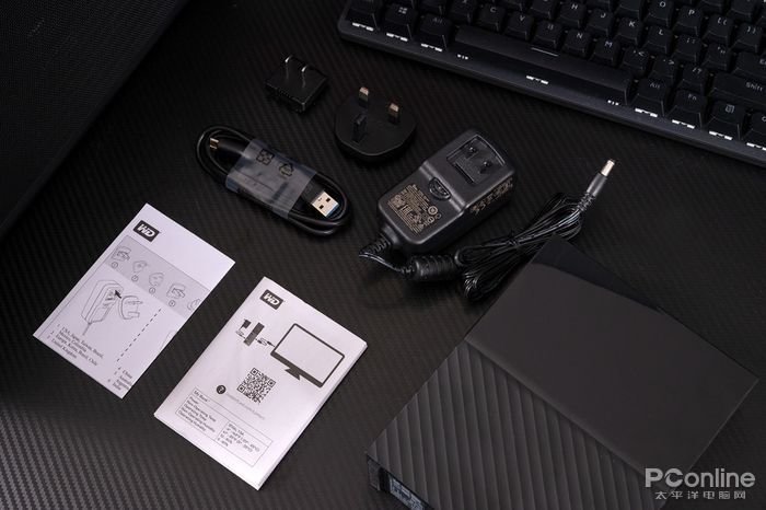 打开包装,可以看到包装盒内分了两格,里面包含了电源、数据线、说明书以及硬盘本体。