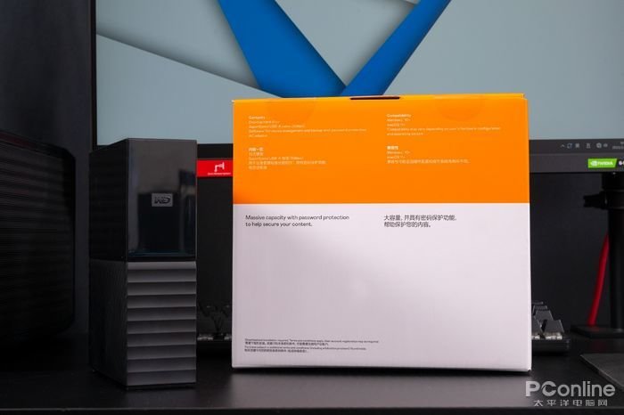 首先引入眼帘的就是WD My Book™台式硬盘硕大的包装盒,包装由原来的青绿色改为更显活力的橙色,正面很简洁,左上角醒目的WD Logo,右上角标识了容量22TB。左下角则是3年售后,西数备份,西数安全等字样。