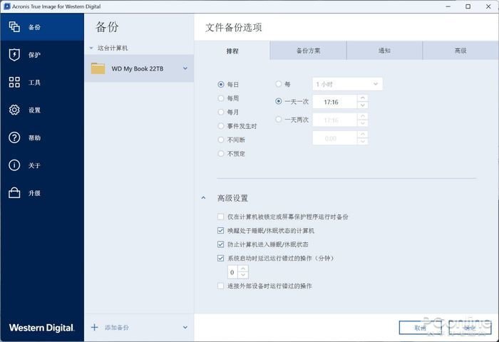 备份软件可帮助您按照计划自动保护重要文件。WD Drive Utilities软件会寻找您文件夹内的数据并将其添加至您的备份计划。您只需选择备份的时间、日期和频率就可以备份。
