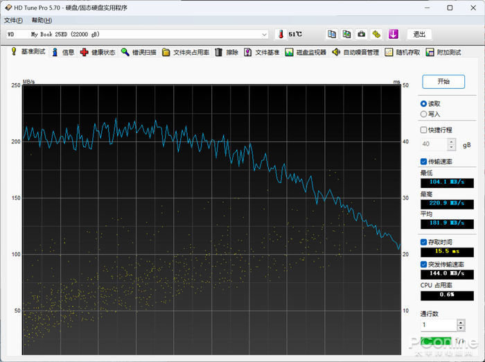 在另一款测试软件HD Tune中,WD My Book™台式硬盘的读取测试最高速率达到220.9MB/s,最低104.1MB/s,平均读取速度达到了181.9MB/s,整体的读取速度也在USB 3.2 Gen1的水准。