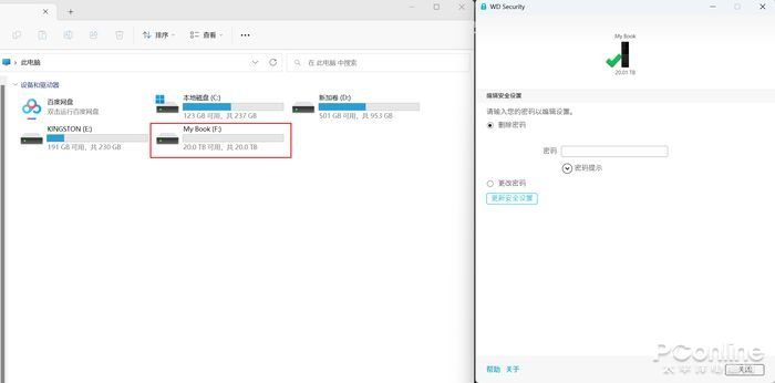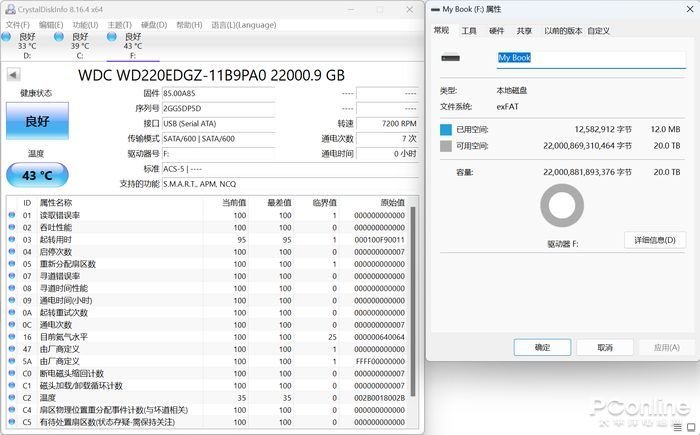 首先看看它的存储容量,我使用的是22TB版本的WD My Book™台式硬盘,由于厂商生产硬盘一般是1TB=1000GB,但在电脑设备上,则是按照理论上的1TB=1024GB来计算的,所以在电脑上显示的实际容量,与22TB是有一些差别的。WD My Book™台式硬盘在电脑上显示的是22000.9GB的容量,容量是够的。