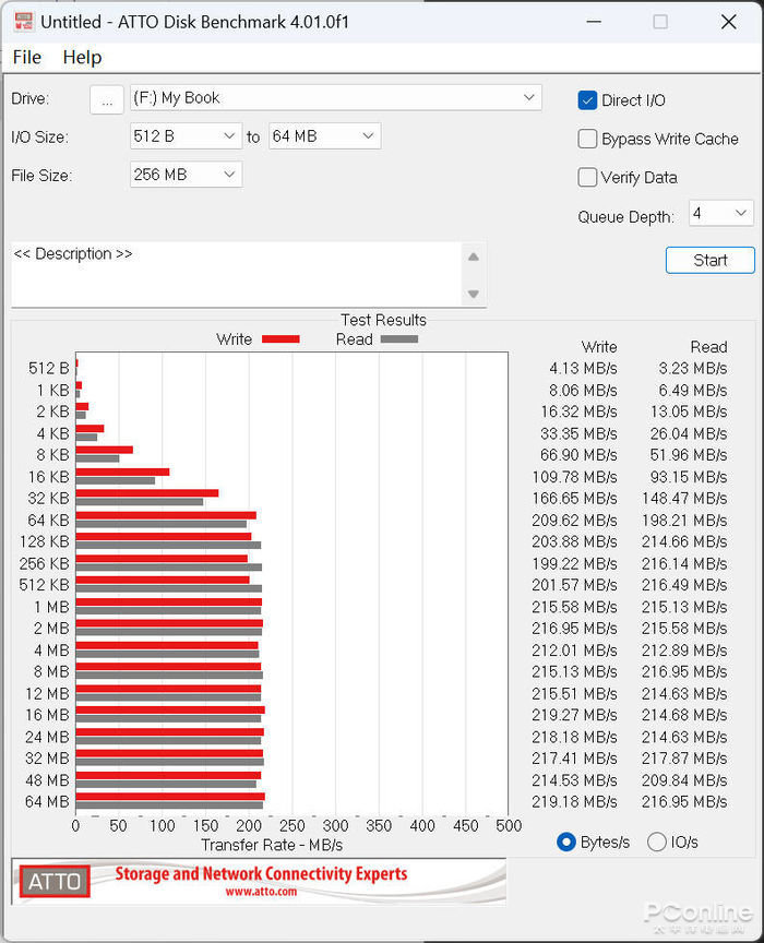 我们使用ATTO对WD My Book™台式硬盘的零碎文件读写能力进行测试,测试结果显示,WD My Book™台式硬盘在拷贝128KB以上数据级文件时读取速度稳定在215MB/s以上,写入速度也能维持在200MB/s,用作电脑的文件中转站,这个速度绰绰有余了。