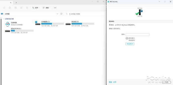 当处于密码保护之中的WD My Book™台式硬盘连接任意电脑(没有设置过自动解锁功能)时,将不会在电脑中显示,也无法访问该移动硬盘中的数据。