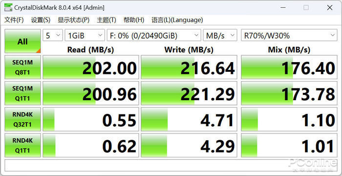 实测,WD My Book™台式硬盘1GB文件单线程8队列深度的顺序读取速率为202MB/s,写入速度也有216.64MB/s。在16线程32队列的随机读写测试中,1GB测试的随机读取速率为200.96MB/s,随机写入速度为221.29MB/s。