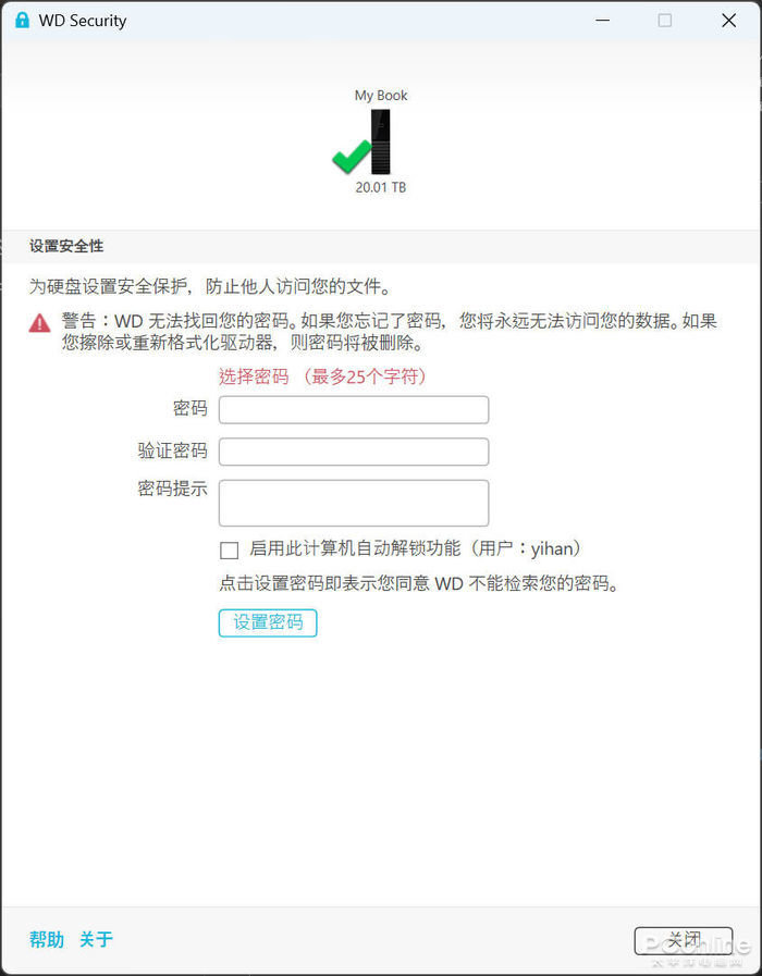 软件使用也很简单,激活密码保护功能,设置自己的密码即可,请一定要注意保管好自己设置的密码,如果密码丢失,您存储在该设备上的数据将无法访问!除此之外还能设置WD My Book自动解锁计算机上的硬盘,免去输密码的麻烦。