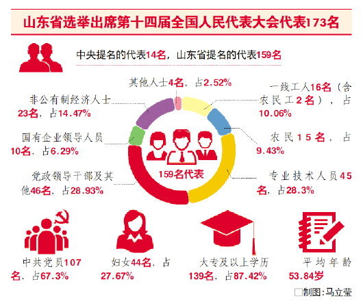 山东省选举出席第十四届全国人民代表大会代表173名。其中,中央提名的代表14名,山东省提名的代表159名。