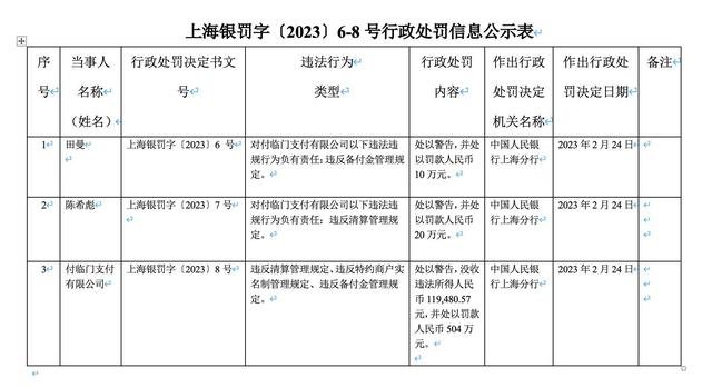 与此同时,因对付临门违反备付金管理规定的违法违规行为负有责任,相关责任人田曼被处以警告,并处以罚款10万元;因对付临门违反清算管理规定的违法违规行为负有责任,相关责任人陈希彪被处以警告,并处以罚款20万元。