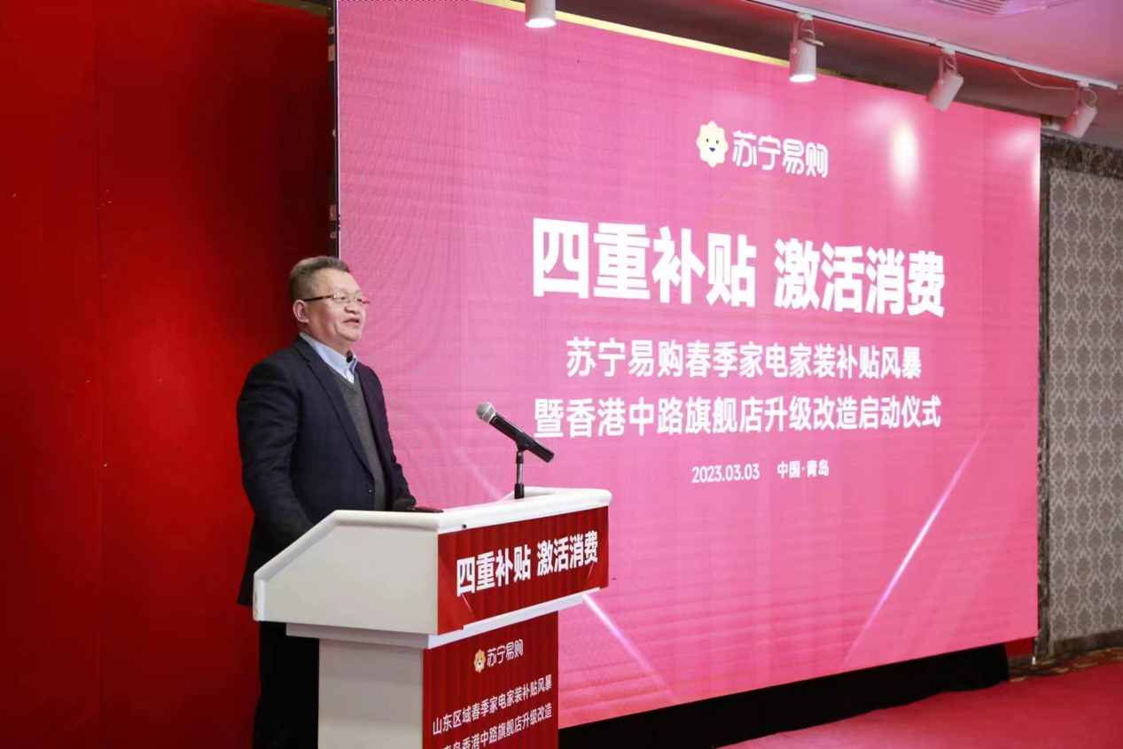 3月3日上午,亿惠青岛消费年系列活动—苏宁易购山东大区促消费暨青岛香港中路旗舰店升级改造启动仪式在青岛市南区举行。