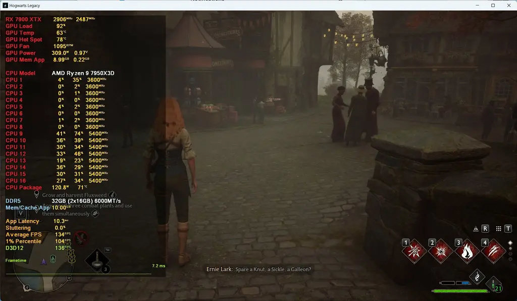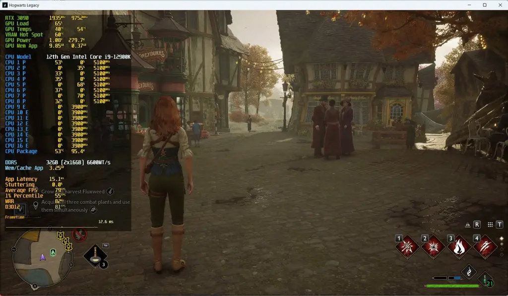 以《霍格沃兹之遗》(Hogwarts Legacy)游戏为例,英特尔酷睿 i9-12900K 和 AMD 锐龙 7950X3D 两款处理器在开启 thread affinity 之后的改进。在英特尔方面,P 核负责主要游戏渲染工作。