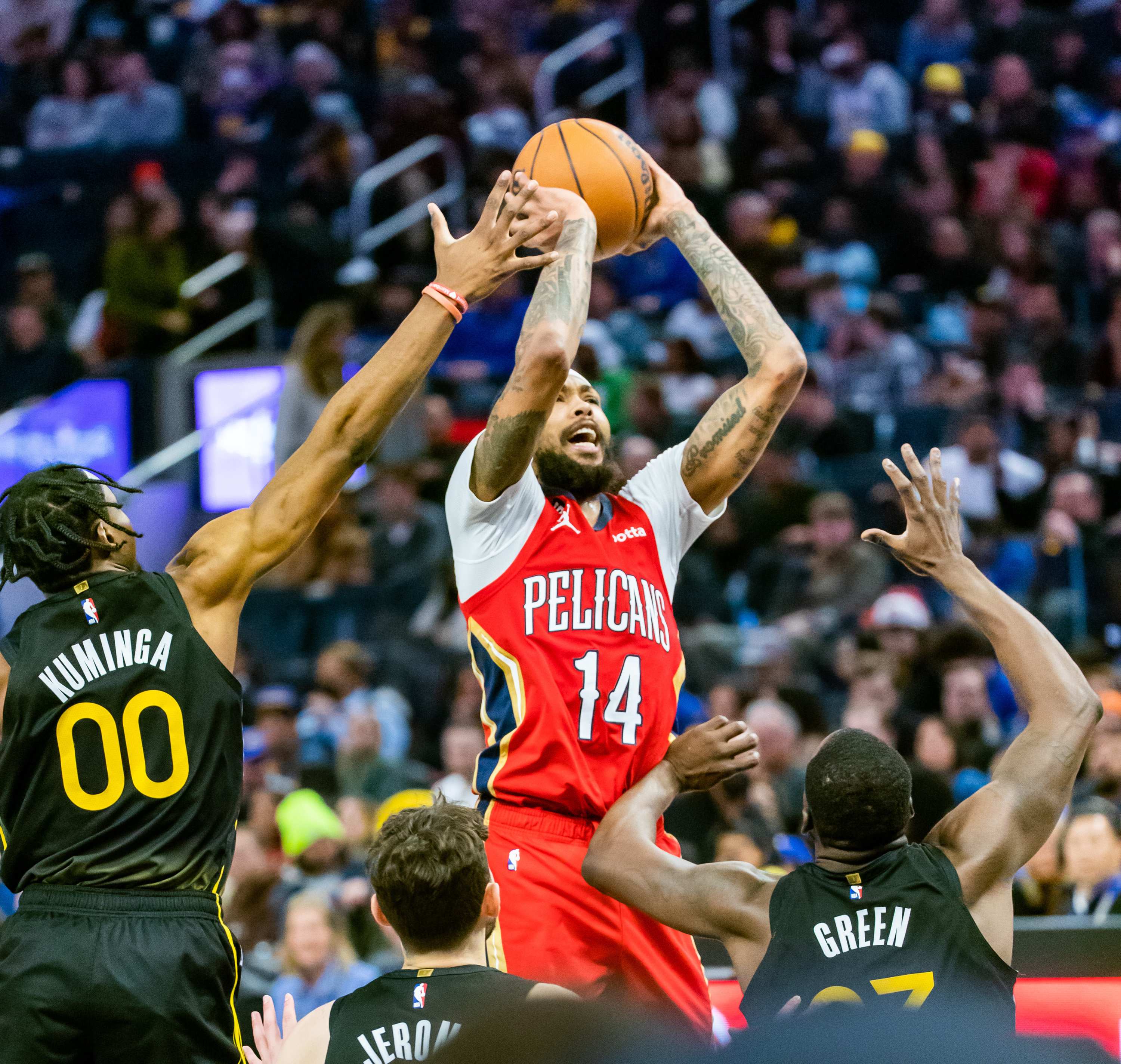 3月3日,鹈鹕队球员英格拉姆(中)在比赛中投篮。新华社发(董旭东摄)