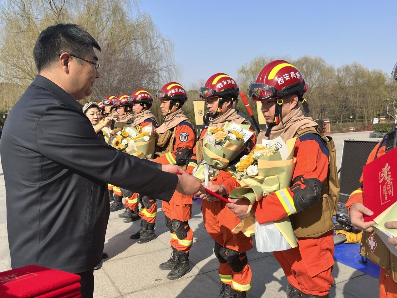 欢迎仪式上,高新区应急管理局向刘帅等14名队员送上鲜花,高新区应急管理局负责人向救援队队员颁发荣誉证书。区内爱心企业陕西鼓风机(集团)有限公司代表发表了热情洋溢的致辞,并联合西安华科光电有限公司、西安今盛电气设备有限公司、陕西天和照明设备工程有限公司、西安双特智能传动有限公司向高新区特种应急救援中心捐赠慰问金。