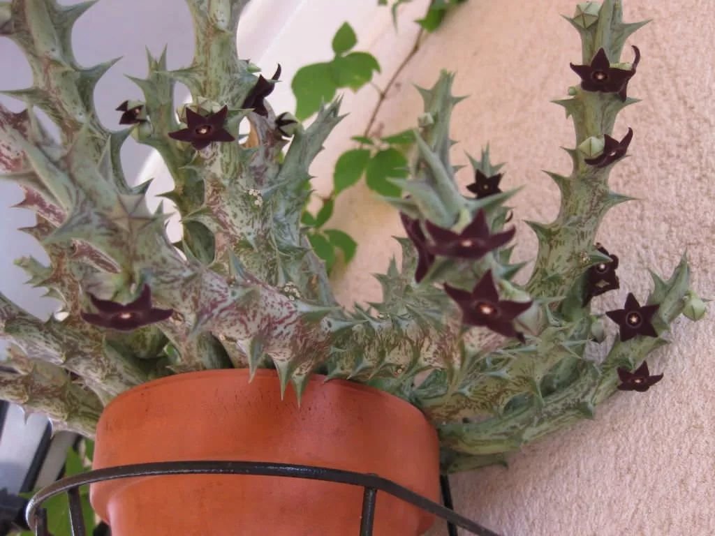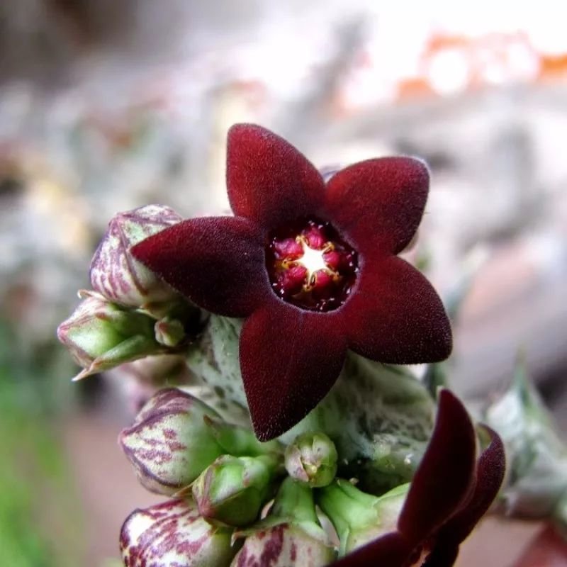 紫龙角的花朵还是挺好看的,花色是棕红色的,就是一个个五角星的形态。