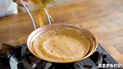 手腕转动煎锅,让面糊自然流开