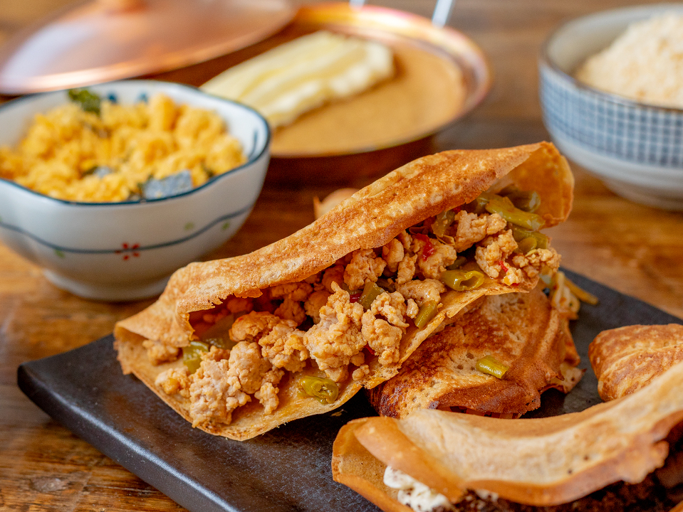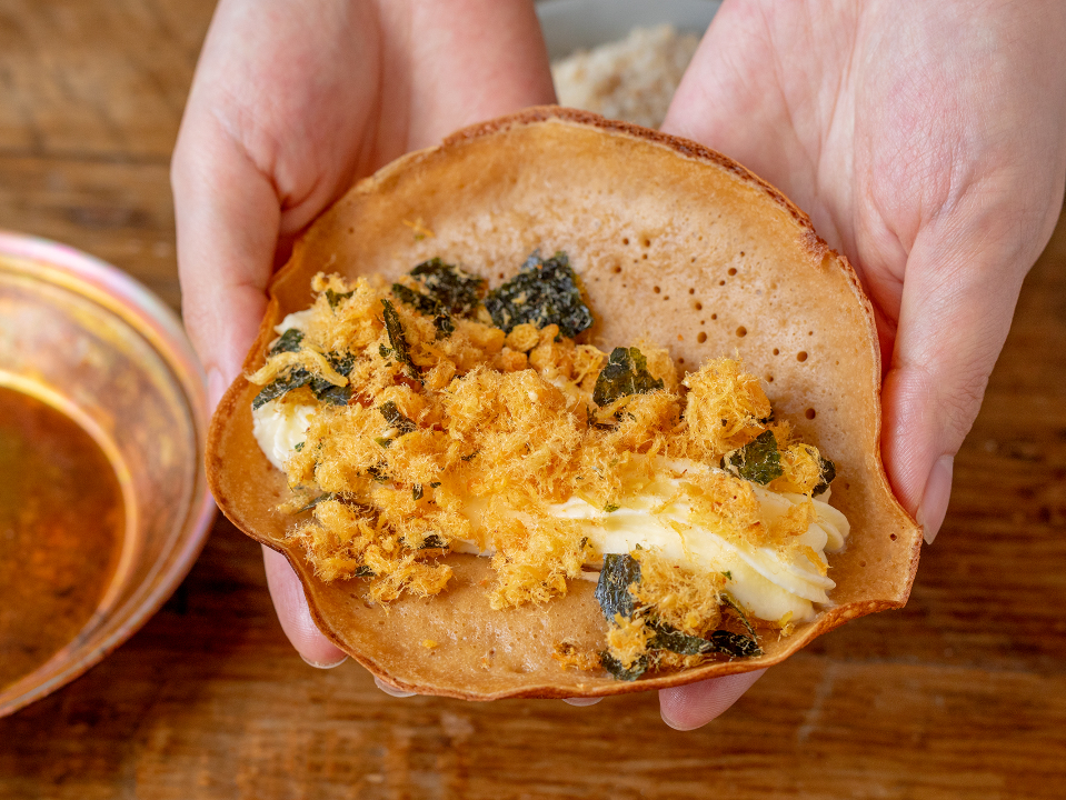 蛋烘糕的神奇之处在于,无论是西式的奶油奶酪、中式的芝麻花生,还是开胃下饭的神品酸豇豆肉末,它都能毫无违和感的包裹住。酸甜咸辣皆可,能吃上一个月都不重样。