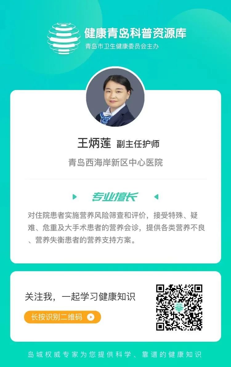 主任护师,注册营养师,本科学历,学士学位。1992.7月参加工作,就职于枣庄矿业集团中心医院,主要从事内科护理工作,2016.3月调入青岛西海岸新区中心医院,随即于青大附院营养科进修。2016.9月成立营养科,主要从事临床营养工作。