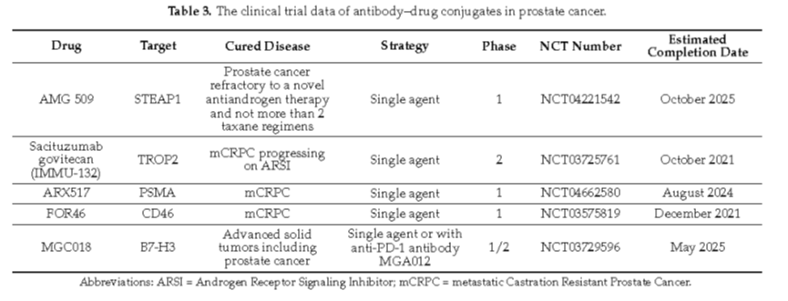 2.Rosellini M, Santoni M, Mollica V, Rizzo A, Cimadamore A, Scarpelli M, Storti N, Battelli N, Montironi R, Massari F. Treating Prostate Cancer by Antibody-Drug Conjugates. Int J Mol Sci. 2021 Feb 4;22(4):1551. doi: 10.3390/ijms22041551.