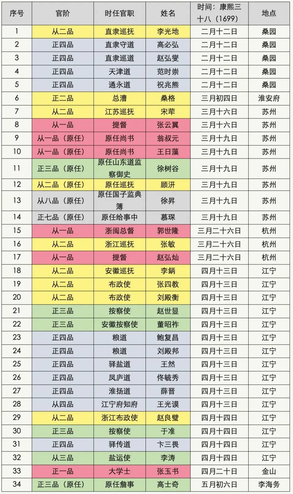 据笔者统计康熙帝第三次南巡期间赏赐《御制耕织图》的官员名单(表2),其中官阶一品(含从一品及原任)的有6位,分别是:提督张云翼、原任尚书翁叔元、原任尚书王日藻、浙闽总督郭世隆、提督赵弘灿及大学士张玉书;二品官员(含从二品及原任)有9位:直隶巡抚李光地、总漕桑格、江苏巡抚宋荦、原任巡抚顾汧、浙江巡抚张敏、安徽巡抚李鈵、布政使张四教、布政使刘殿衡、浙江布政使赵良璧;三品官员(含从三品及原任)有6位:原任山东道监察御史徐树谷、按察使赵世显、安徽按察使董昭祚、按察使于准、盐运使李涛、原任詹事高士奇;四品官员(含从四品)有11位:直隶守道高必弘、直隶巡道赵弘燮、天津道范时崇、通永道祝兆熊、粮道鲍复昌、粮道刘殿邦、驿盐道王然、凤庐道佟毓秀、淮扬道薛晋、江宁府知府王光谟、驿传道卞三畏;原任七品及八品的官员有2位:原任国子监典簿徐昇、原任给事中慕琛。被赏赐的官员官阶大多在四品以上,从内阁大臣到地方高官皆有赏赐,多是掌握地方实权的重要文职官员。