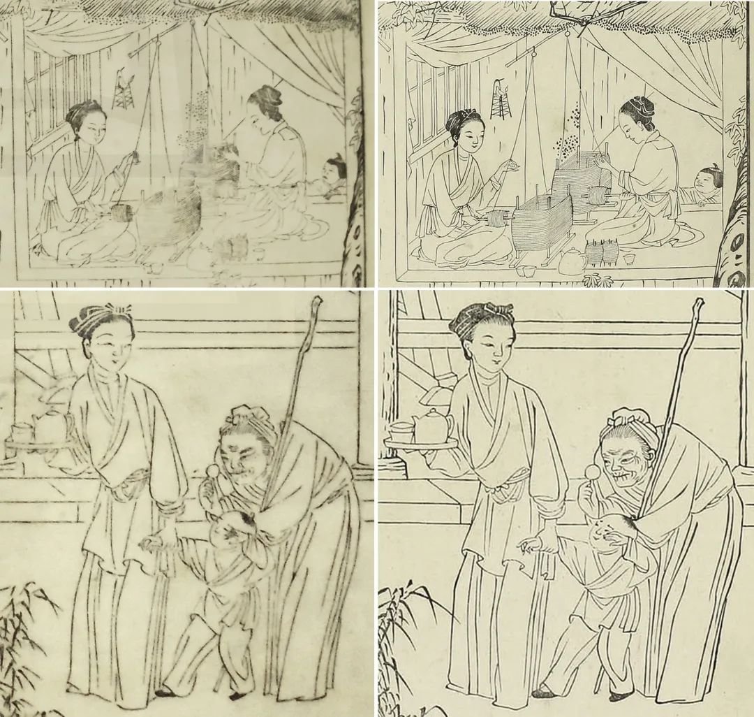 在版本样态上可以看到,康熙三十五年本《御制耕织图》(原刻本)与张鹏翮翻刻本的异同还是比较明显的。存世的《御制耕织图》版画,因刻有康熙三十五年(1696)御题序言,多标榜为“清康熙三十五年本”,但其中不乏多部翻刻本,郭立暄首先区分了《御制耕织图》的原刻初印本与原刻后印本,并列举了两个翻刻本。