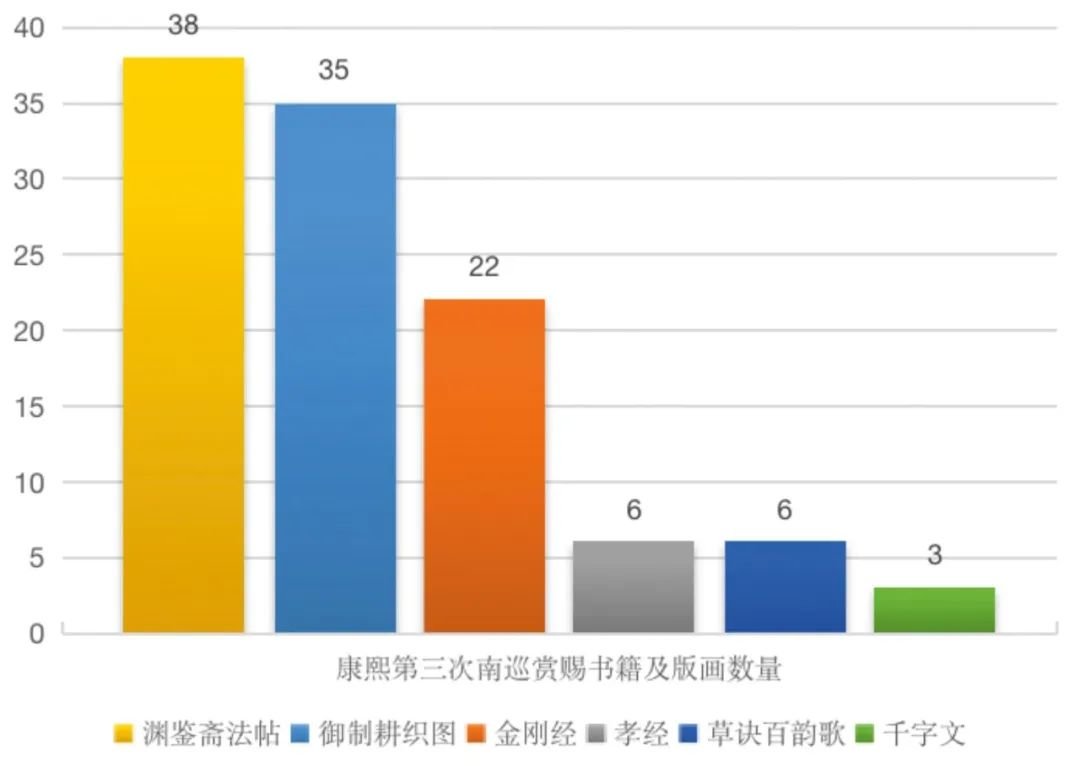 在康熙帝第一次和第二次南巡期间,并未有赏赐官员版画及书籍的相关记载。据常建华的研究,康熙帝前两次南巡除了物品外,赏赐的多是御笔书法及诗文。而从第三次南巡开始,除了赏赐物品及御笔书法外,康熙帝开始赏赐地方官员大量的版画和书籍,其中就包括《御制耕织图》,可见康熙帝在第三次南巡前做了充分准备。同时可以看出,清内府在第二次南巡至第三次南巡的十年间,刊刻了大量书籍与版画。因此,在第三次南巡时,康熙帝可以很好地利用这些印刷品。