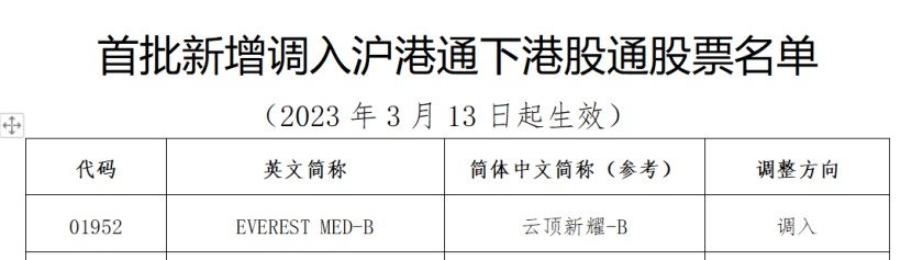 智通财经APP获悉,根据上交所3月3日发布的沪港通股票名单调整公告,云顶新耀-B(01952)成功进入沪港通下港股通股票名单,下周一(3月13日)起生效。
