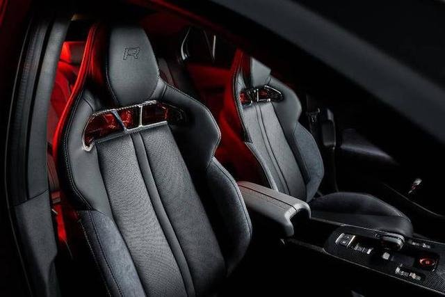 内饰方面维持原来的双联屏布局,界限更加突出高性能,除了常规的转速、时速、挡位信息外,增加的五连仪表展现出涡轮压力、机油温度、机油压力、水温、进气温度等参数,还中控部分加入了换挡提示功能。装饰采用了大量翻毛皮和碳纤维材质,还有最吸引眼球的就是两张桶形座椅,头枕上印有“R”标记。