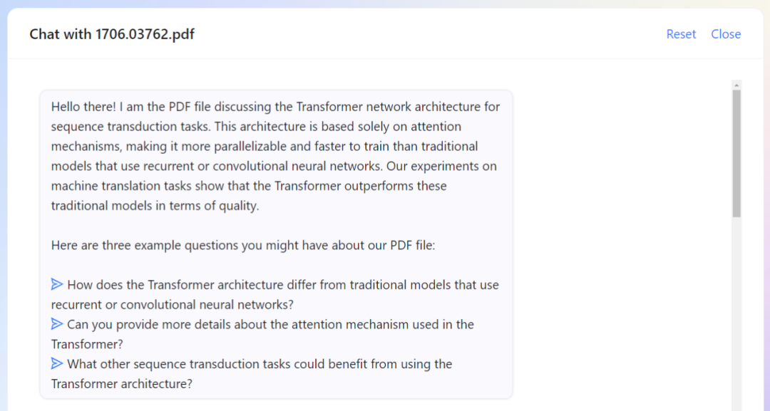 然后我们又尝试用 ChatPDF 读论文,以提出 transformer 的经典论文《Attention Is All You Need》为例,ChatPDF 生成的摘要抓住了这篇论文的核心是「自注意力机制」。