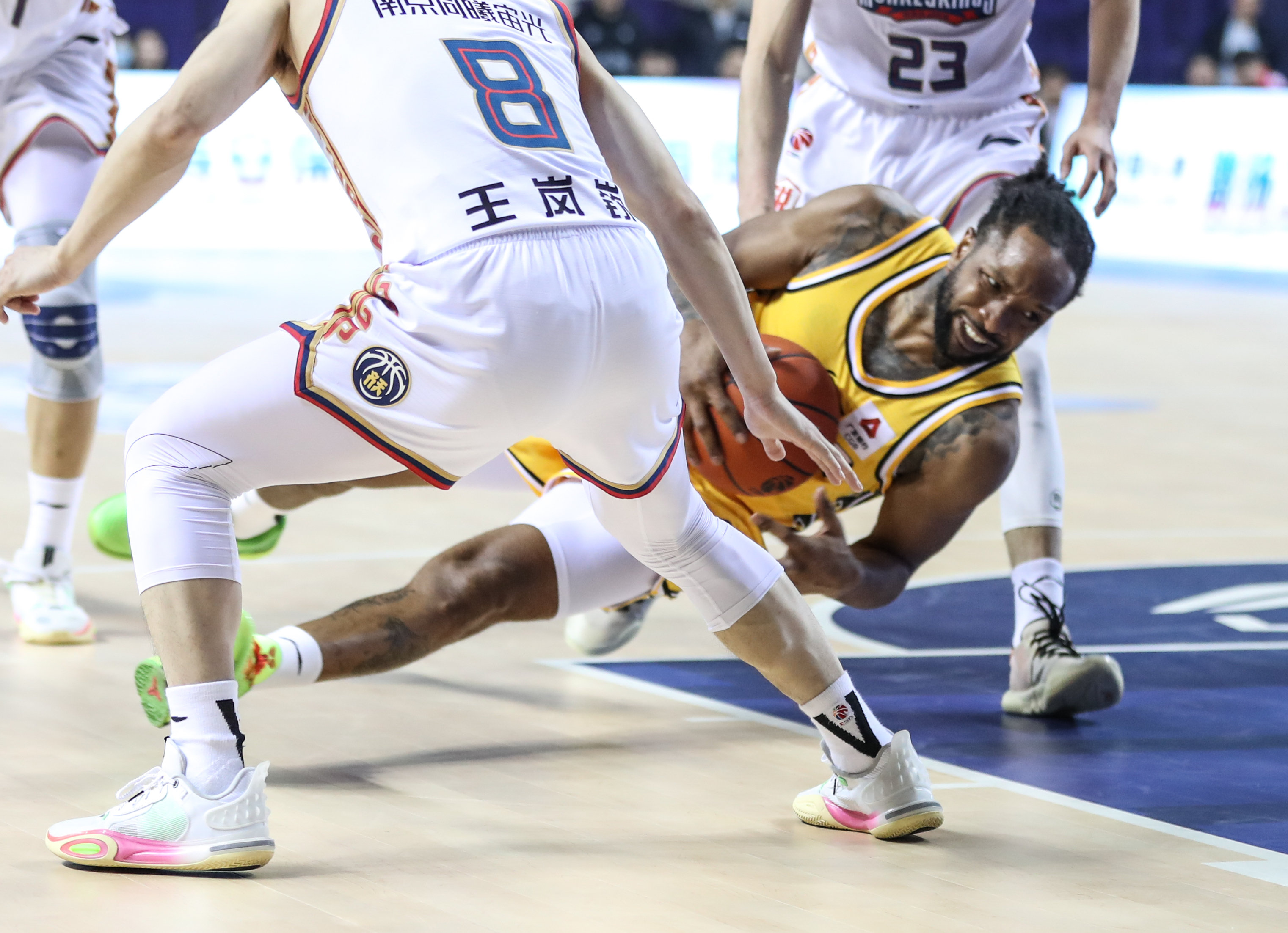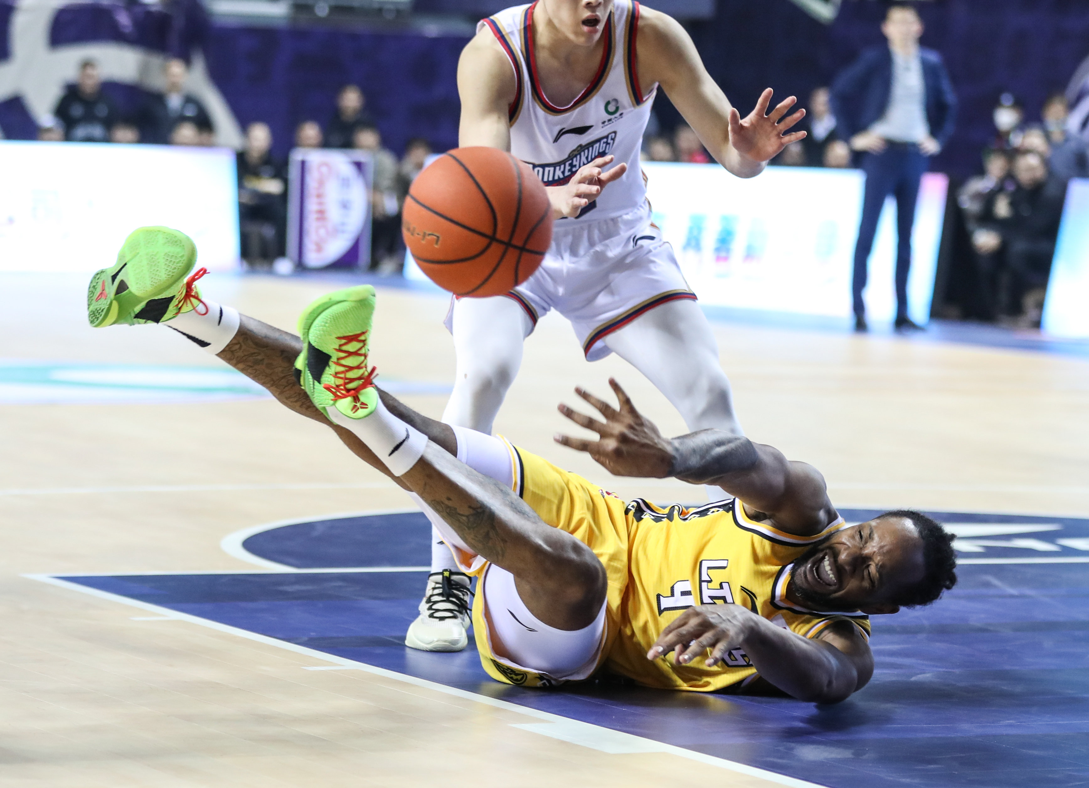 3月9日,浙江东阳光队球员威尔斯(下)在比赛中倒地传球。新华社记者 杨磊 摄