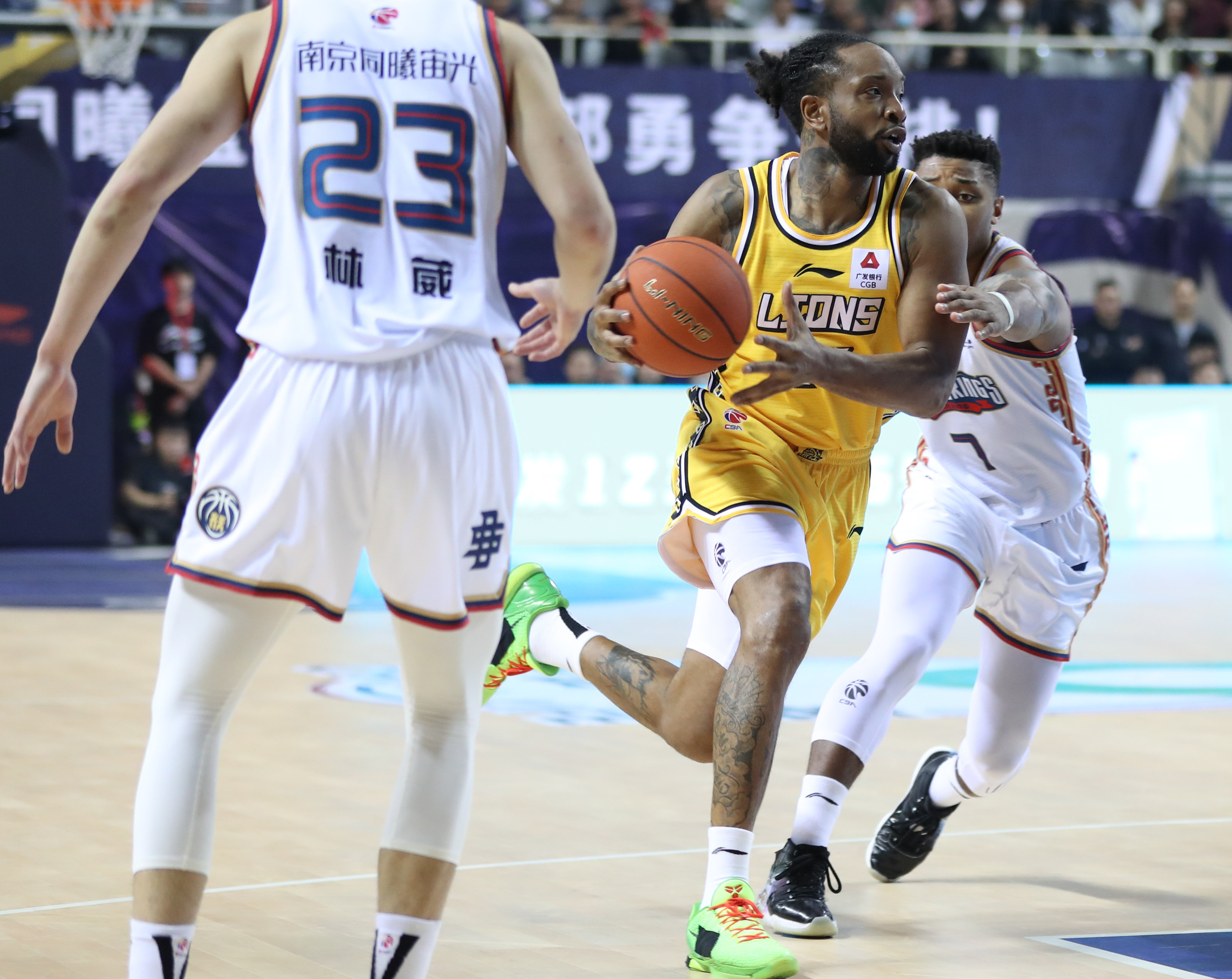 3月9日,浙江东阳光队球员威尔斯(中)在比赛中持球突破。新华社记者 杨磊 摄