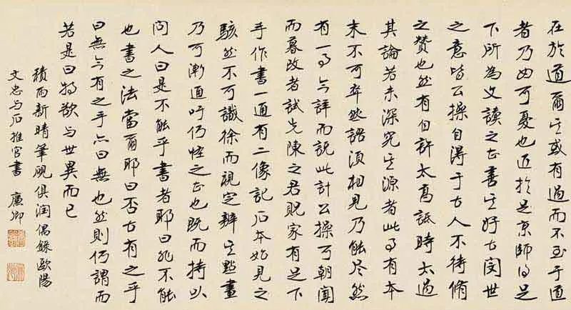 从上述记载看来,张裕钊书写的运笔并不复杂,很是自然流畅。两次重复提到“明指得力,指能转笔”,即无名指用力和转笔,便于笔力贯穿笔画始终,从而笔画的运行始终保持中锋轨迹。为了做到这一点,他甚至会在书写时刻意地放慢速度。