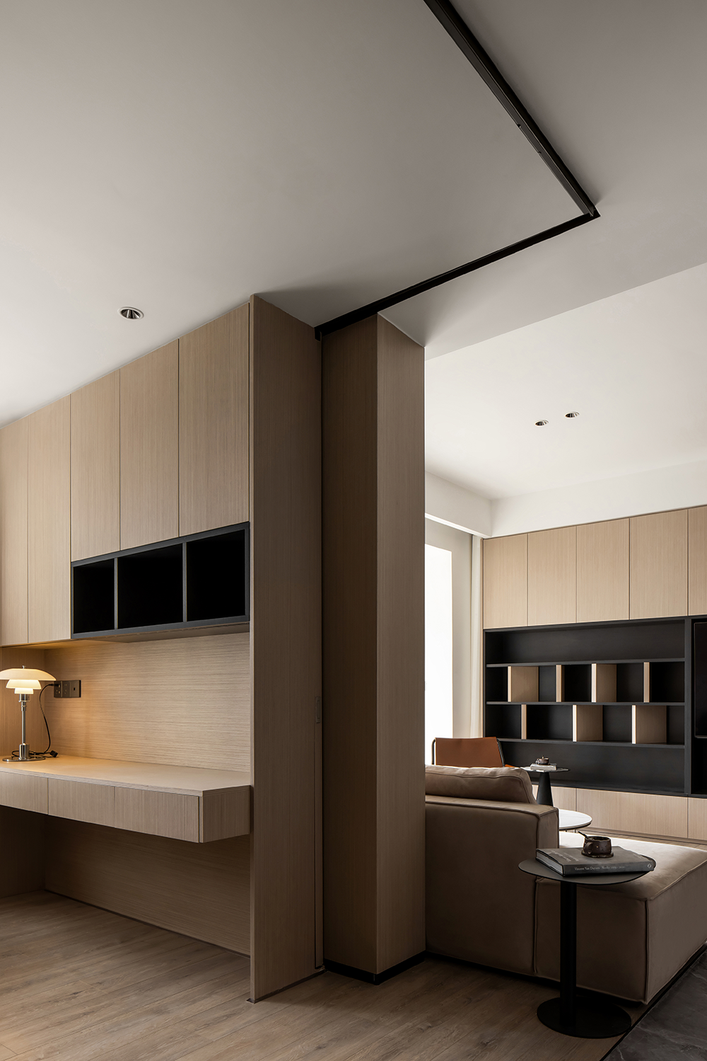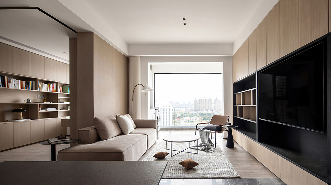 ▲沙发墙的后面是一扇与柜子同材质的木移门,不封闭的时候,把移门藏起来,空间感也变大了。