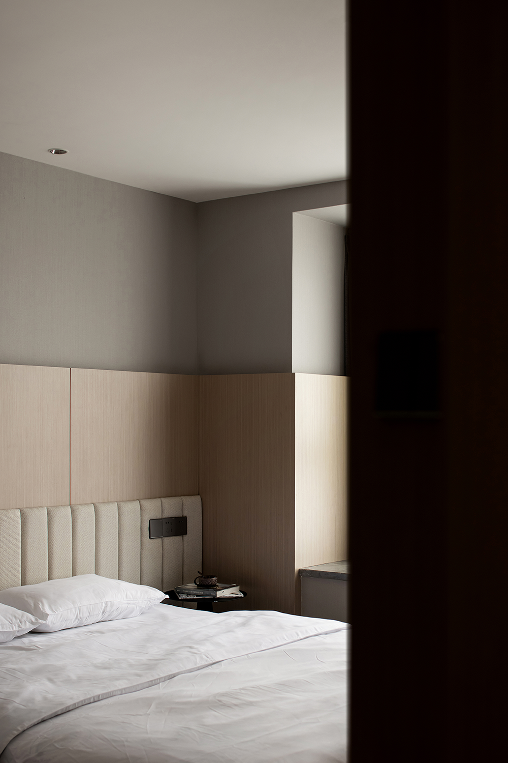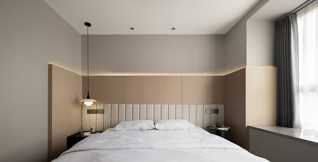 ▲主卧的床头做成U形的木制背景墙,仿佛床被这个背景很好的包裹住,让睡在这里的人也更有安全感。