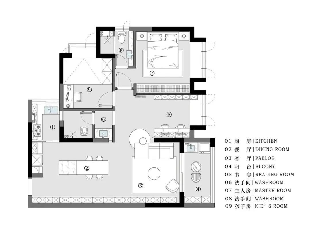▲①鞋柜+餐边柜+电视柜一整排定制,保证其整体性;②岛台+餐桌结合,满足多种生活场景需求;③把生活阳台改造成中厨,扩大了餐厅的区域;④书房做成一个弹性空间,暗藏推拉移门结合玻璃折叠门可实现开放及封闭式两种形式的书房。