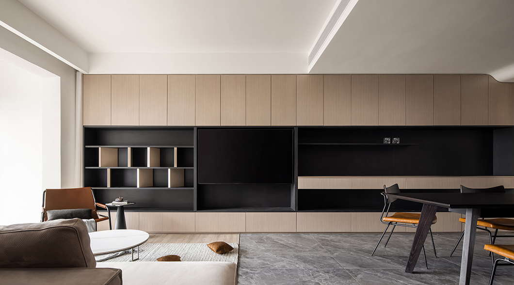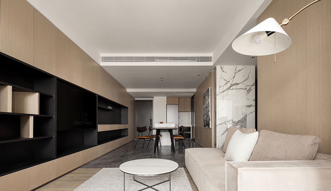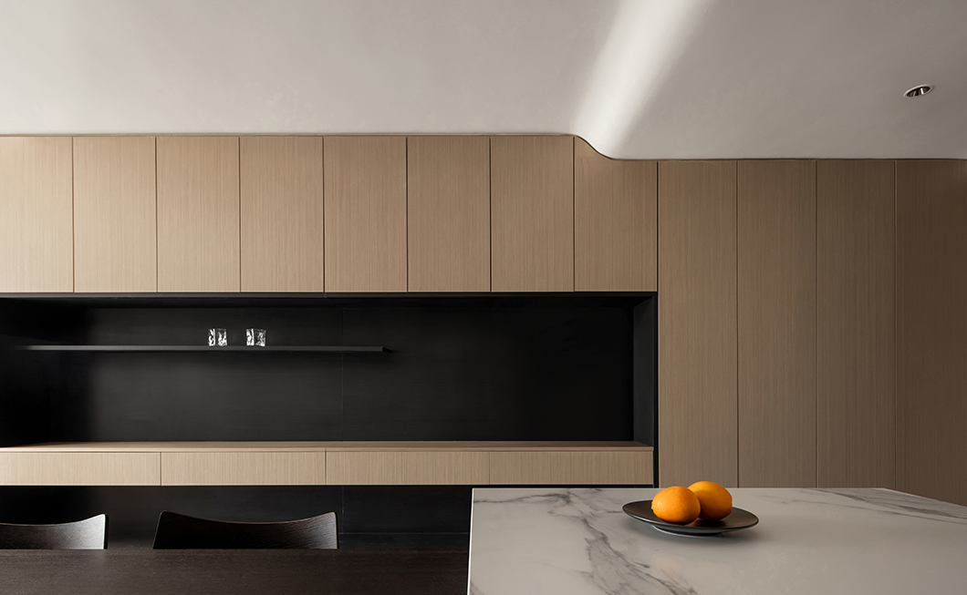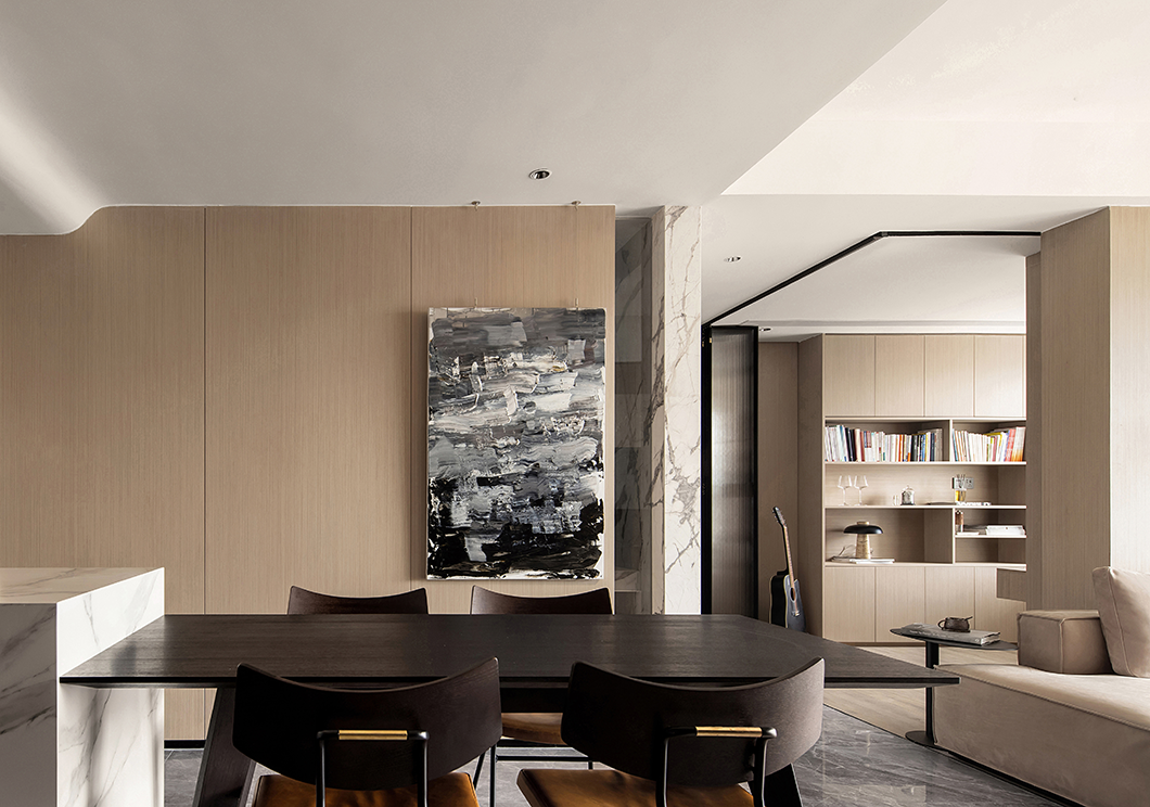 ▲客餐厅整体给人的感觉是大气,高级有格调的,也许这就要归功于材料及颜色的搭配,大面积的浅色木饰面,再用黑色木饰面搭配,最后用白色大理石来点缀,自然温馨又高级。