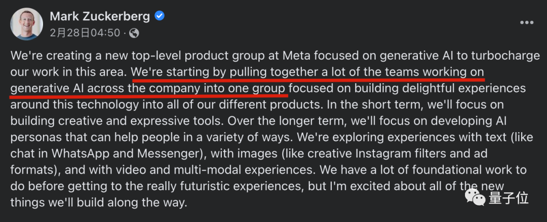 今年2月底,扎克伯格面对ChatGPT热潮再次做出调整,宣布成立顶级AI产品团队。