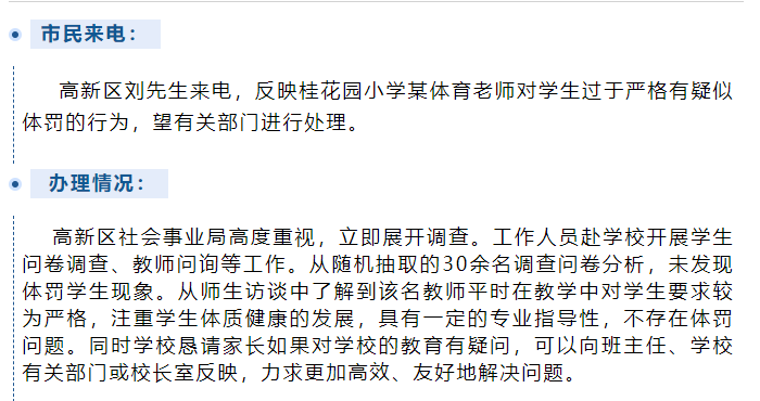 办理情况:高新区社会事业局高度重视,立即展开调查。工作人员赴学校开展学生问卷调查、教师问询等工作。从随机抽取的30余名调查问卷分析,未发现体罚学生现象。从师生访谈中了解到该名教师平时在教学中对学生要求较为严格,注重学生体质健康的发展,具有一定的专业指导性,不存在体罚问题。同时学校恳请家长如果对学校的教育有疑问,可以向班主任、学校有关部门或校长室反映,力求更加高效、友好地解决问题。