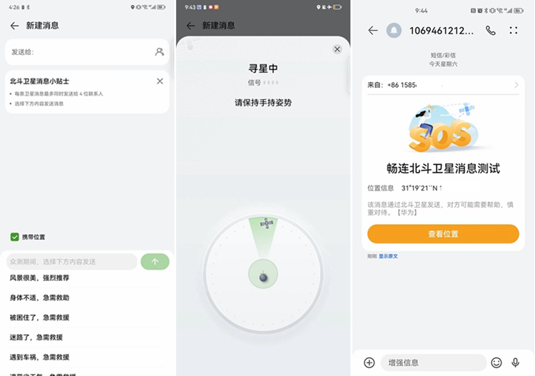 所以华为Mate50系列的卫星短报文功能,只能发送文字短消息,而且在众测阶段,只能发送系统预置的文字短消息,包含定位消息,当北斗卫星接收到短信后,再转发给运营商的卫星地面站,再转发给收信人。