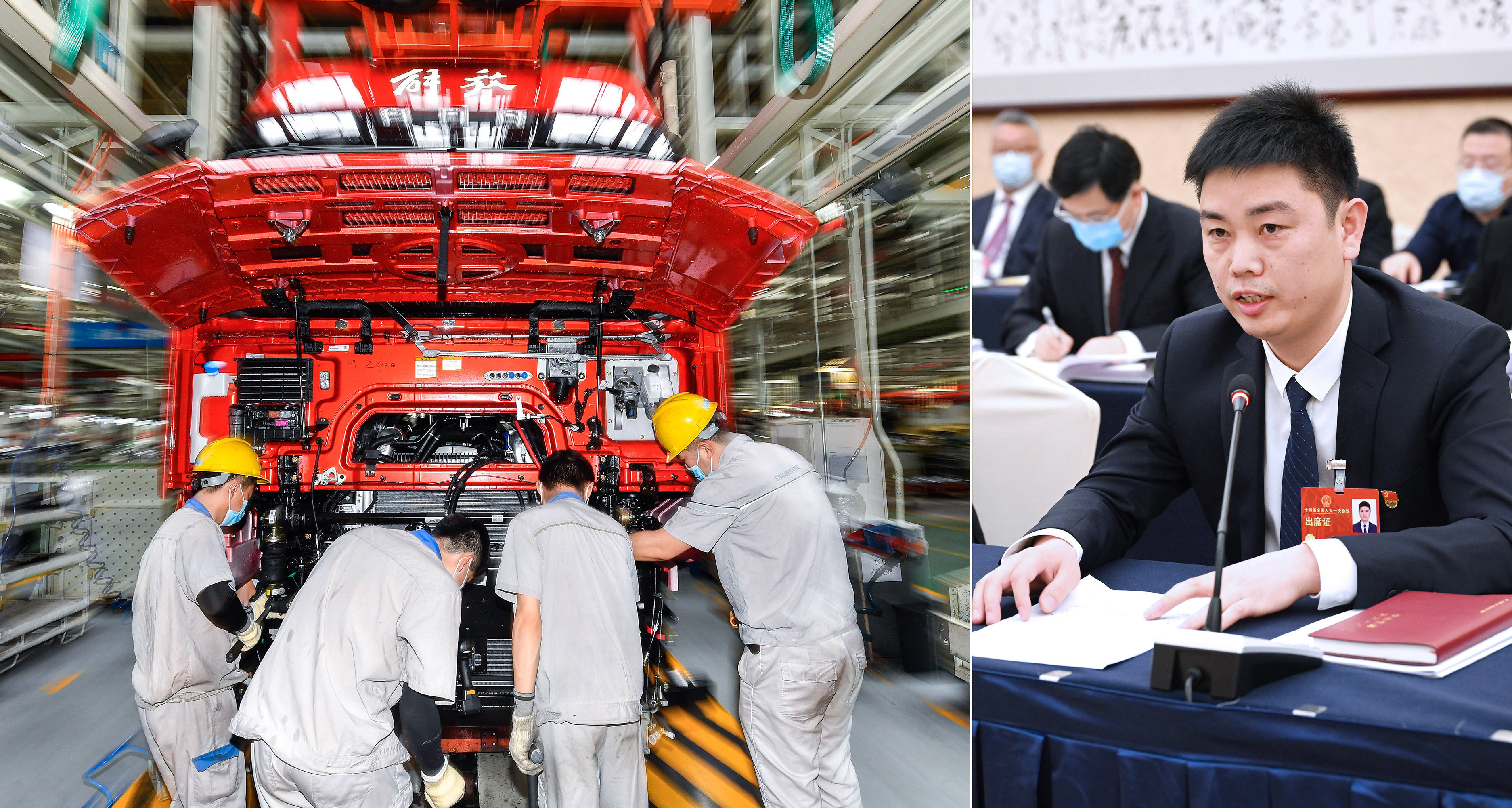 左图为2022年6月15日,工人在位于吉林长春的一汽解放总装车间内装配车辆(新华社记者许畅摄)。右图为杨永修代表(新华社记者熊争艳摄)。