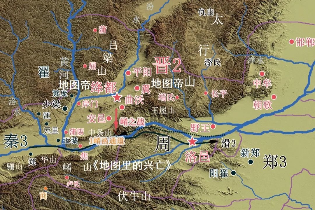 从地势上讲,崤函通道是太行山南部一段东西走向的山体与秦岭合夹而成的一条走廊,该走廊与黄河流向一致,而黄河北岸正是河东。因此从理论上说,只要河东仍被晋国控制,任何想要进出崤函通道的军队都会遭到晋军的前后夹击。