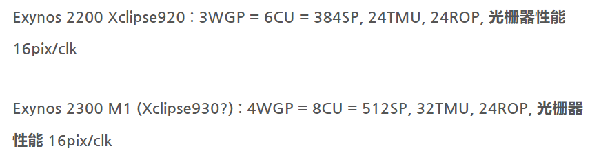 根据 GPU 代号和规格推算,Exynos 2400 可能会采用 M2 GPU(Exynos 2200 和 Exynos 2300 指标见下图),拥有 6WGP(12CU = 768SP)、48TMU、32ROP,光栅性能 32pix / clk。